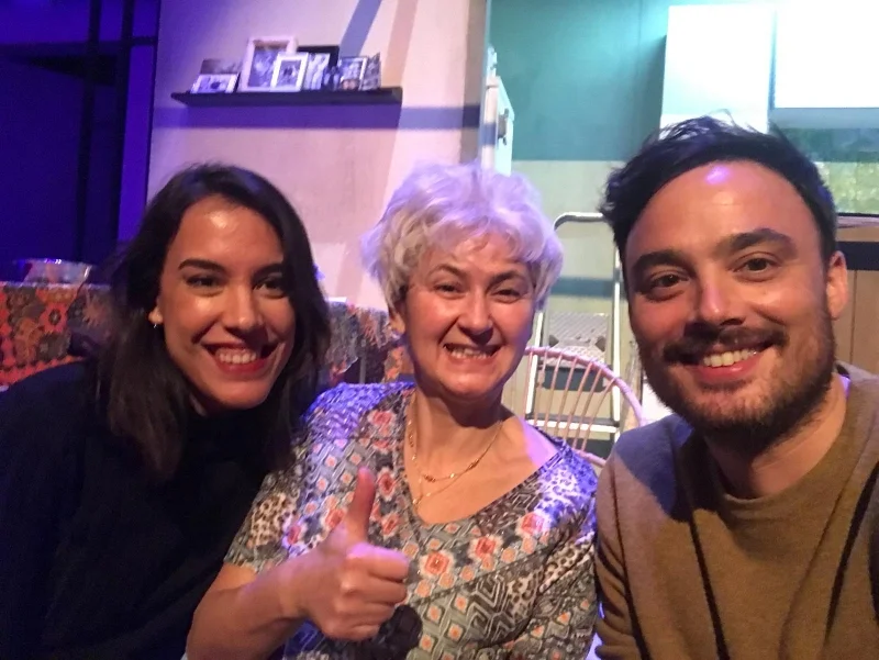 Met Gouwe Pinda's Nonni (Bodil de la Parra) en eeuwige vriend Chris Belloni na afloop van de voorstelling. 02 januari 2017.
